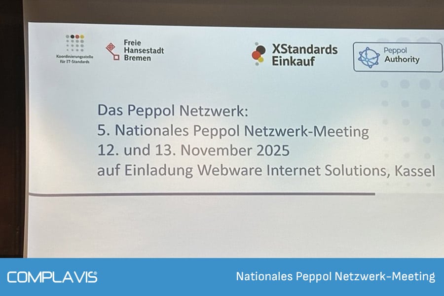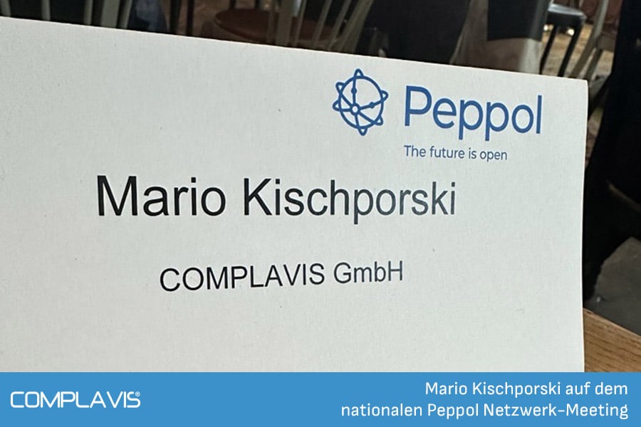 Am 12. und 13. November nahm COMPLAVIS® am nationalen 5. Peppol Netzwerk-Treffen in Kassel teil. Vor Ort vertreten wurde COMPLAVIS® durch Mario Kischporski. Im Fokus der Veranstaltung standen aktuelle Entwicklungen, gesetzliche Rahmenbedingungen und technische Fragestellungen rund um die E-Rechnung und das Peppol-Netzwerk. COMPLAVIS® ist aktiver Teilnehmer für seine Kunden im Rahmen des Peppol-Netzwerks.